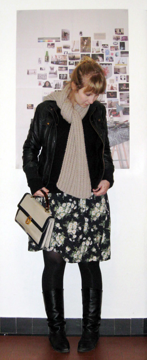 Le temps ensoleillé donne déjà envie de petites robes en toile et d’imprimés fleuris, mais vu qu’il fait quand même frais, je la réchauffe avec les moyens du bord. Ca donne un petit look très printanier, j’aime bien. »