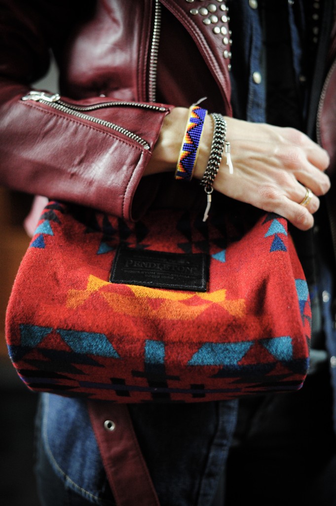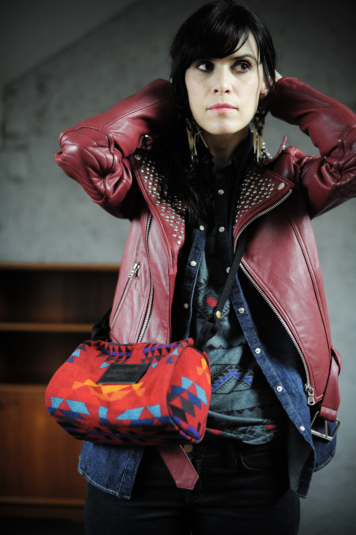 Genre je suis chic, avec mon flare en velours, ma chemise en jean, mon perf’ rouge foncé clouté et mon sac Pendelton, mais bien sûr! 😉
