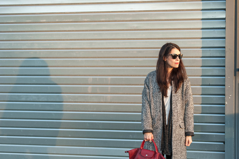 Mais il n’empêche que j’aime bien le mélange de ces pièces, du féminin (mon « chiffon » à empiècements dentelle) du masculin/féminin (mon manteau) du « sport » (mes baskets) et des touches de rouge pour dynamiser et rendre plus chic le tout!