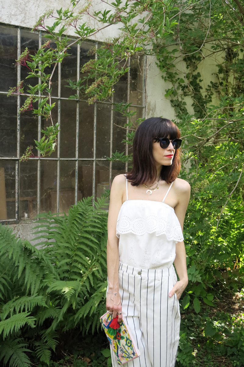 La base du jour, c’est ce petit ensemble très frais que j’ai concocté, à base de pantalon large/jupe culotte (encore?? oui) et de petit top blanc à volants et brodé.