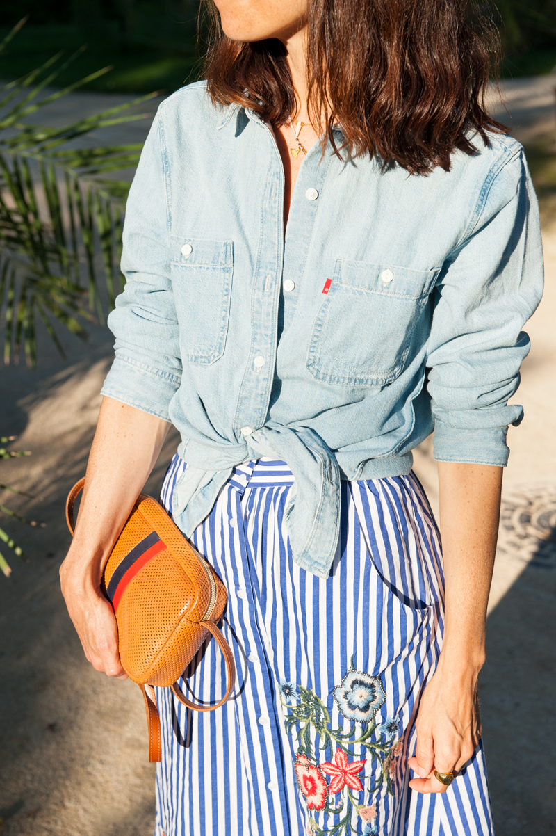 Cette jupe est tellement cool, rayée, brodée, taille haute, elle est vraiment super facile à associer pour créer des styles bien différents, j’adore ça!